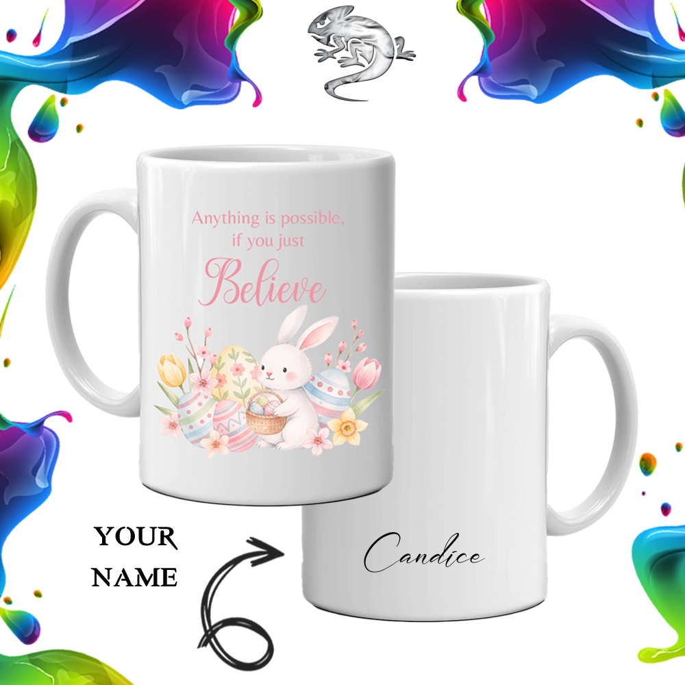 Ceramic Floral Easter Bunny Mug with Name of Your Choice printed on the back of Mug.