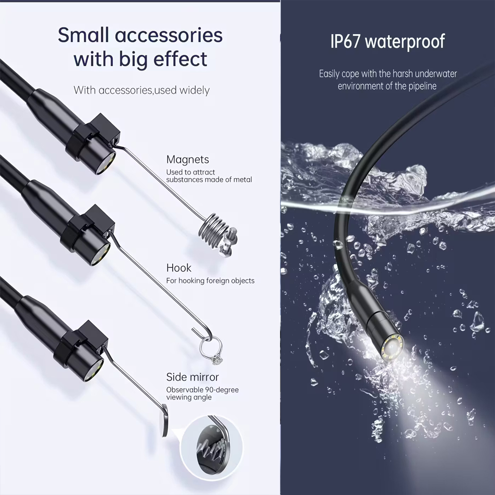 IP67 WATERPROOF :The borescope is rated IP67 waterproof for use in inclement weather and wet environments. The snake camera probe uses an aerospace connector that is water safe to use in pools, plumbing and the rain.